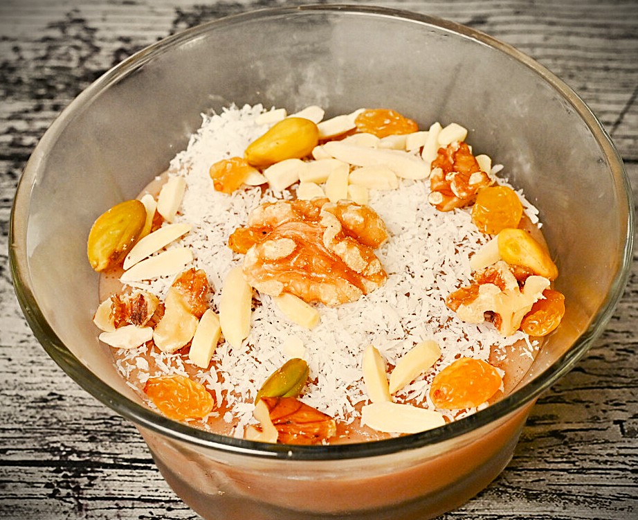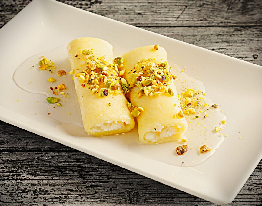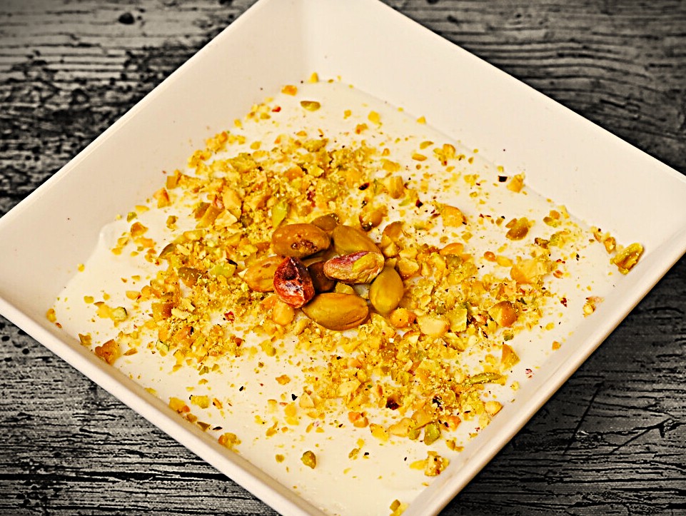 Sedosa crema caliente libanesa de leche y orquĂdea salvaje, sutilmente perfumada con agua de azahar, canela y almáciga, acabada con coco y pistachos. Se acompaña de kaak libanĂ©s, delicados bastones de corteza dorada y crujiente, finamente recubiertos de sĂ©samo tostado.
